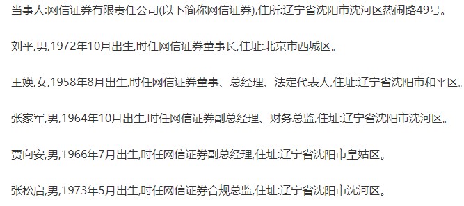 證監(jiān)會(huì)同時(shí)指出,時(shí)任董事長(zhǎng)劉平,全面負(fù)責(zé)公司工作,其在審議通過(guò)2015年至2017年年度報(bào)告的董事會(huì)決議上簽字,在向我會(huì)報(bào)送的2015年至2017年年度報(bào)告上簽字,并保證年度報(bào)告內(nèi)容的真實(shí)、準(zhǔn)確、完整,不存在虛假記載、誤導(dǎo)性陳述或者重大遺漏,是網(wǎng)信證券上述違法行為直接負(fù)責(zé)的主管人員。