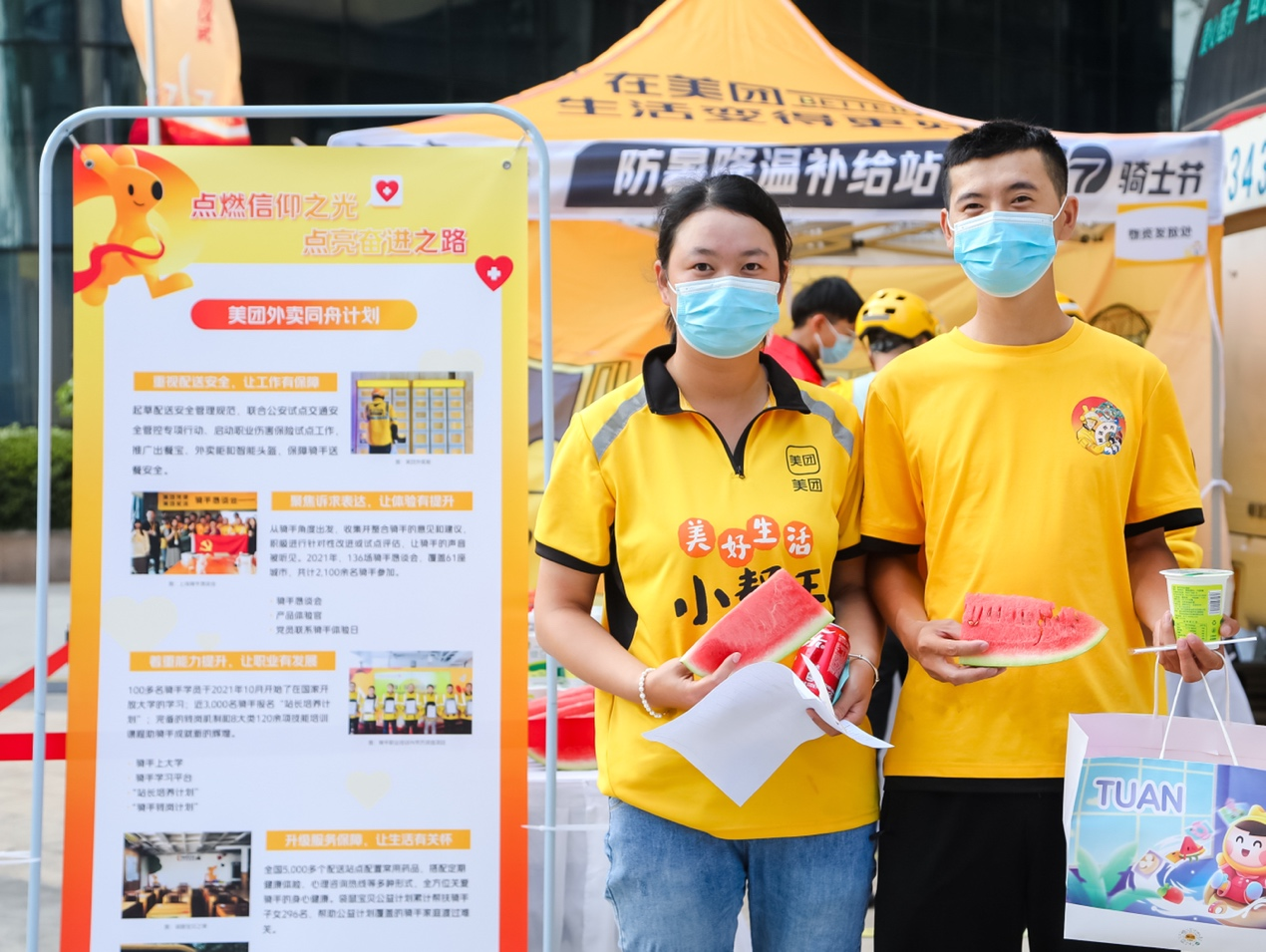 入夏以來,美團配送加強了騎手在高溫天氣下的勞動安全保障措施,在全國配送站點的“同舟守護1㎡”健康服務(wù)專區(qū),添置清涼油、藿香正氣液、退熱貼等夏季常用藥品,717騎士節(jié)前夕,美團配送也向騎手送上冰袖、面罩、防曬衣等防暑物資節(jié)日禮包。針對騎手在日常工作中靈活安排休息時間和場所的習(xí)慣,7月以來,美團配送通過自建和與機構(gòu)合作等方式,在全國上百個城市增設(shè)“防暑驛站”,驛站位于騎手方便前往的美食城、居委會等場所,配備消暑食品、冰鎮(zhèn)飲料等補給品,幫助騎手防暑降溫。
