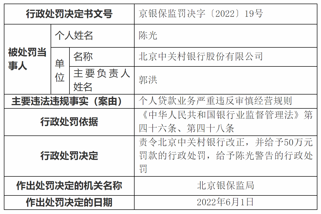 據(jù)銀保監(jiān)會(huì)網(wǎng)站消息,近日北京銀保監(jiān)局對(duì)北京中關(guān)村銀行開出罰單,針對(duì)個(gè)人貸款業(yè)務(wù)嚴(yán)重違反審慎經(jīng)營規(guī)則的違法違規(guī)行為,責(zé)令該行改正,罰款50萬元,并對(duì)責(zé)任人陳光進(jìn)行警告。