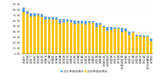 評(píng)估顯示,2021年度各參評(píng)城市綜合得分均值為56.53,比上次評(píng)估得分均值(51.63)增長(zhǎng)9.49%。所有參評(píng)城市綜合得分較上次均有所提升,超過5%的城市有33個(gè),占比達(dá)91.67%;超過10%的城市有12個(gè),占比達(dá)33.33%。