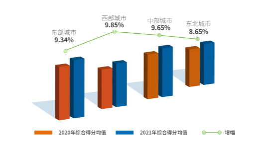 西部各參評(píng)城市2021年綜合得分均值比上次評(píng)估提升9.85%,在各區(qū)域中提升最快,區(qū)域內(nèi)各城市發(fā)展環(huán)境水平差距略有縮小。成都、西安等城市緊扣區(qū)域戰(zhàn)略發(fā)展機(jī)遇期、推動(dòng)產(chǎn)業(yè)轉(zhuǎn)型升級(jí),中小企業(yè)發(fā)展環(huán)境持續(xù)優(yōu)化,與東、中部領(lǐng)先城市差距縮小,對(duì)西部其他城市起到一定的引領(lǐng)示范作用;東北地區(qū)各參評(píng)城市綜合得分均值比上次評(píng)估提升8.65%,增長(zhǎng)率在四個(gè)區(qū)域中最低。受地區(qū)經(jīng)濟(jì)增長(zhǎng)長(zhǎng)期乏力、產(chǎn)業(yè)結(jié)構(gòu)偏老偏重、人口持續(xù)流出等因素影響,東北城市中小企業(yè)發(fā)展較慢,發(fā)展環(huán)境整體改善勢(shì)頭不及其他地區(qū),還需要綜合施策、持續(xù)發(fā)力。
