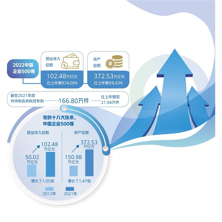 來(lái)自中企聯(lián)的最新數(shù)據(jù)顯示,黨的十八大以來(lái),中國(guó)企業(yè)500強(qiáng)營(yíng)業(yè)收入從2012年的50.02萬(wàn)億元增長(zhǎng)到2021年的102.48萬(wàn)億元,增長(zhǎng)了1.05倍,邁上百萬(wàn)億元臺(tái)階;資產(chǎn)總額從150.98萬(wàn)億元增長(zhǎng)到372.53萬(wàn)億元,增長(zhǎng)了1.47倍。