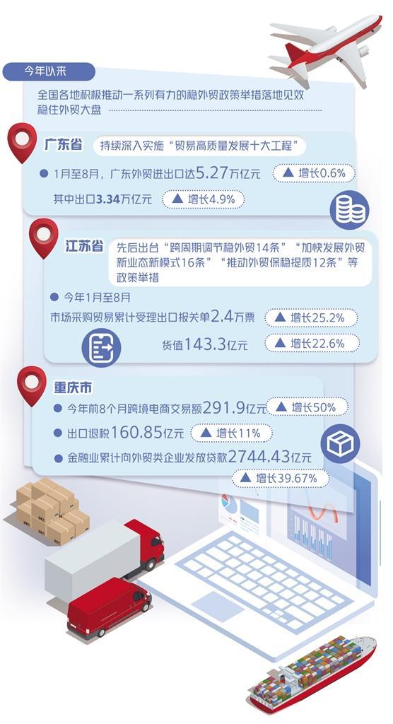 跨境電商等新業(yè)態(tài)也成為穩(wěn)外貿(mào)的重要力量。今年,重慶成功舉辦了跨境電商交易會(huì),積極推動(dòng)跨境電商“保稅進(jìn)口+零售分裝”業(yè)務(wù)試點(diǎn),推廣“跨境電商+產(chǎn)業(yè)帶”模式,為外貿(mào)企業(yè)穩(wěn)訂單、拓市場(chǎng)提供了新的解決方案。今年前8個(gè)月,重慶跨境電商交易額達(dá)291.9億元,增長(zhǎng)50%。
