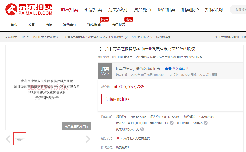青島慧據(jù)智慧城市產(chǎn)業(yè)發(fā)展有限公司30%的股權(quán)以7.07億元成交,成為本屆“標(biāo)王”。北京四中院處置的北京市海淀區(qū)西三環(huán)北路“光耀東方”項目,評估價超10.7億元,于11月11日以6.02億元成交。北京市朝陽區(qū)景林路的一處房產(chǎn),在近萬人的圍觀下,經(jīng)過55次競價后,以1.58億成交,成為京東11.11期間成交額最高的單體住宅項目。許昌晨鳴紙業(yè)股份有限公司名下機(jī)器設(shè)備一宗,最終以2.6億元成功拍出,溢價1.6億元,溢價率達(dá)160%。