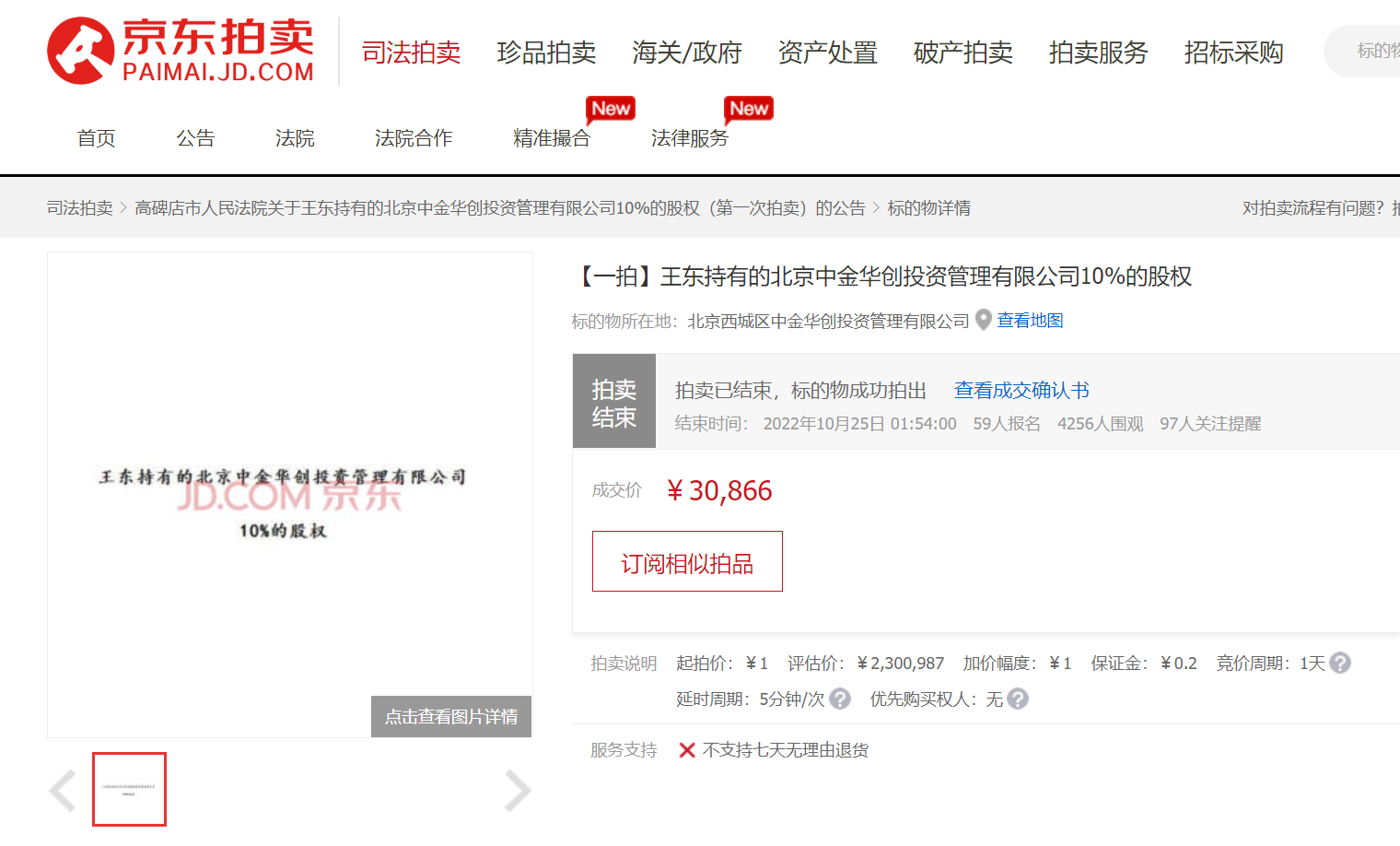 實在的價格充分激發(fā)了競買人對資產(chǎn)處置標(biāo)的的熱情。某自然人持有的北京中金華創(chuàng)投資管理有限公司10%的股權(quán),以1元價格起拍,共有59人報名,經(jīng)過3202次競價,最終以3.09萬元成交,此次拍賣也創(chuàng)造了京東拍賣11.11期間競拍次數(shù)最多的紀(jì)錄。