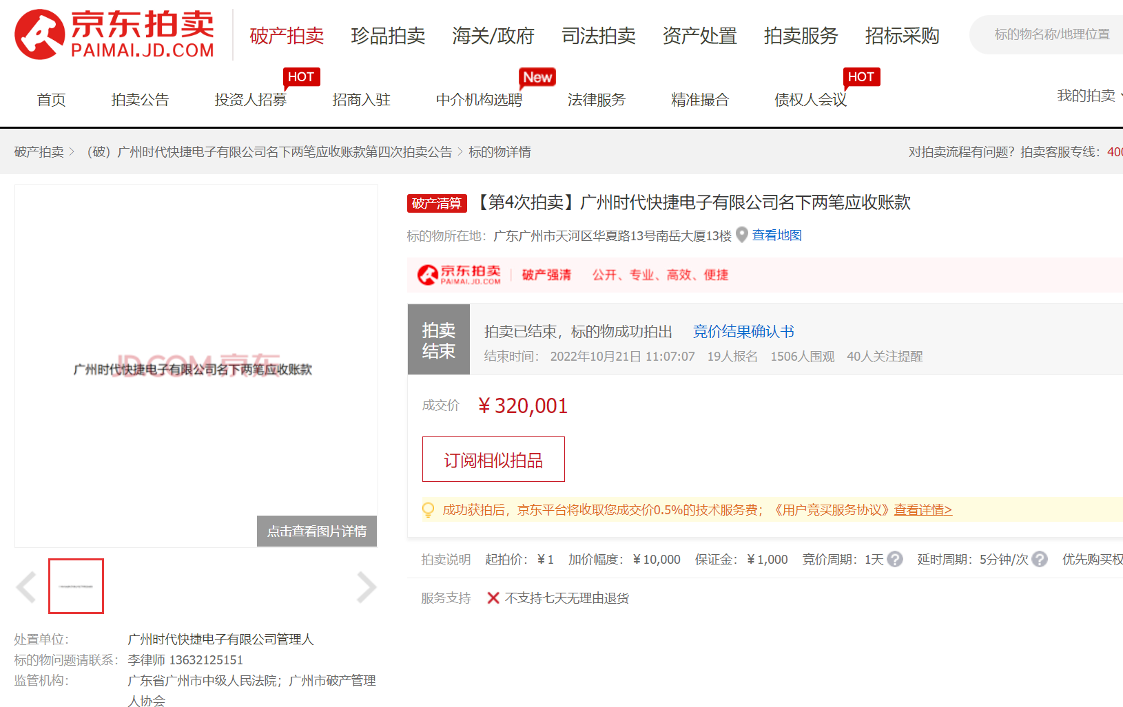 低起拍價對消費者的吸引力十足,在濃厚的競價氛圍中,創(chuàng)造了超高溢價率。1元起拍的廣州時代快捷電子有限公司名下兩筆應(yīng)收賬款,于10月21日以320001元成交,溢價倍數(shù)高達(dá)320000。