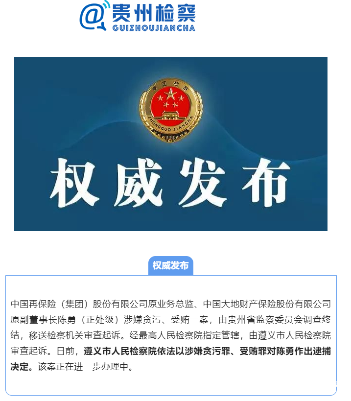 11月30日,貴州省人民檢察院通報,中國再保險(集團)股份有限公司原業(yè)務總監(jiān)、中國大地財產(chǎn)保險股份有限公司原副董事長陳勇(正處級)涉嫌貪污、受賄一案,由貴州省監(jiān)察委員會調查終結,移送檢察機關審查起訴。