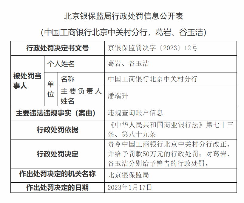 1月28日,北京銀保監(jiān)局行政處罰信息公開表顯示,中國工商銀行北京中關村分行主要違法違規(guī)事實為,違規(guī)查詢賬戶信息。2023年1月17日,北京銀保監(jiān)局責令中國工商銀行北京中關村分行改正,并給予罰款50萬元的行政處罰;對葛巖、谷玉潔分別給予警告的行政處罰。