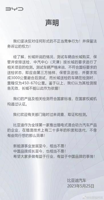 25日,長城汽車發(fā)布聲明稱,4月11日向生態(tài)環(huán)境部、國家市場監(jiān)督管理總局、工業(yè)和信息化部遞交舉報材料,舉報比亞迪秦PLUS DM-i、宋PLUS DM-i采用常壓油箱,涉嫌整車蒸發(fā)污染物排放不達標(biāo)的問題。