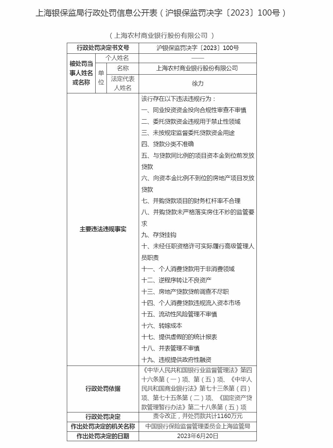 對此,上海銀保監(jiān)局依據(jù)《中華人民共和國銀行業(yè)監(jiān)督管理法》第四十六條第(一)項、第(五)項、《中華人民共和國商業(yè)銀行法》第七十三條第(四)項、第七十五條第(二)項、《固定資產(chǎn)貸款管理暫行辦法》第二十八條第(五)項的規(guī)定,對上海農(nóng)商銀行作出責令改正,并處罰款共計1160萬元。作出行政處罰決定日期為2023年6月20日。
