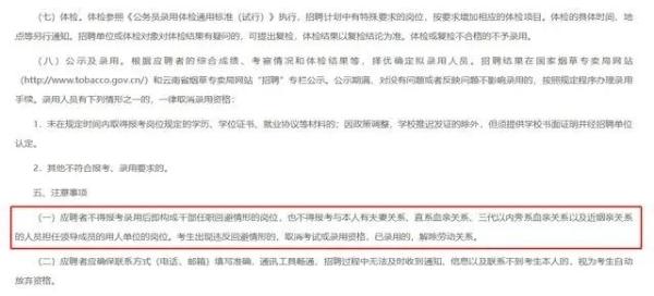 該公告第二條第八款規(guī)定,符合煙草行業(yè)招聘工作回避制度規(guī)定,應(yīng)聘人員不得應(yīng)聘錄用后即構(gòu)成干部任職回避情形的崗位,也不得應(yīng)聘與本人有夫妻關(guān)系、直系血親關(guān)系、三代以?xún)?nèi)旁系血親關(guān)系以及近姻親關(guān)系的人員擔(dān)任領(lǐng)導(dǎo)成員的單位系統(tǒng)的崗位。
