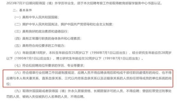比如青海省煙草專(zhuān)賣(mài)局(公司)于7月13日發(fā)布的2023年高校畢業(yè)生招聘公告,同樣明確提出:應(yīng)聘人員不得報(bào)考與本人有夫妻關(guān)系、直系血親關(guān)系、三代以?xún)?nèi)旁系血親關(guān)系以及近姻親關(guān)系的人員所屬市州局(公司)相關(guān)崗位。應(yīng)聘人員的直系親屬、三代以?xún)?nèi)旁系血親以及近姻親有在青海煙草系統(tǒng)工作的,報(bào)名時(shí)須如實(shí)說(shuō)明。故意隱瞞不報(bào)的,一經(jīng)查實(shí),直接取消考試或錄用資格;已經(jīng)錄用的,依法解除勞動(dòng)關(guān)系。