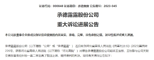 12月18日午間,承德露露(SZ000848,股價(jià)7.70元,市值81.05億元)發(fā)布公告稱,公司近日收到河北省高級(jí)人民法院(以下簡(jiǎn)稱“河北高院”)《民事判決書(shū)》(2023)冀民終226號(hào)(以下簡(jiǎn)稱“判決書(shū)”)。