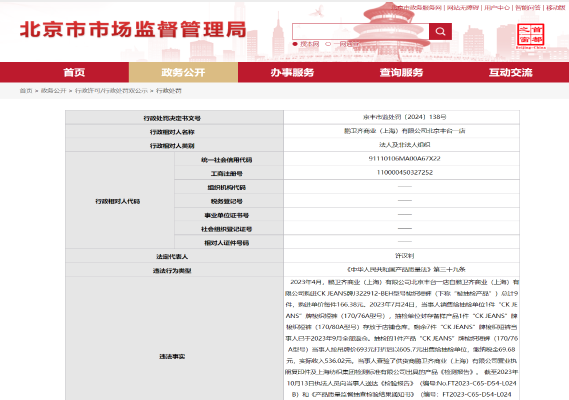 此前,據(jù)新京報等媒體報道,CK運營主體鵬衛(wèi)齊商業(yè)(上海)有限公司多次因以次充好被罰。