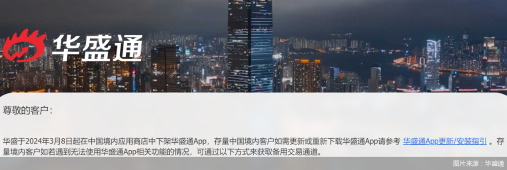 3月8日,華盛證券宣布,自當(dāng)日起在中國(guó)境內(nèi)應(yīng)用商店下架華盛通App。華盛證券表示,此次調(diào)整不影響存量境內(nèi)客戶繼續(xù)使用華盛通App。存量境內(nèi)客戶仍可通過(guò)華盛通App進(jìn)行交易,相關(guān)服務(wù)和業(yè)務(wù)均不受影響。此外,公告還指出,未來(lái)華盛證券將繼續(xù)服務(wù)好所有存量境內(nèi)客戶,為存量境內(nèi)客戶提供優(yōu)質(zhì)產(chǎn)品、服務(wù)及客戶體驗(yàn)。