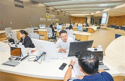 在海口江東新區(qū)政務(wù)服務(wù)中心辦事大廳,工作人員為市民提供咨詢服務(wù)。李天平 攝