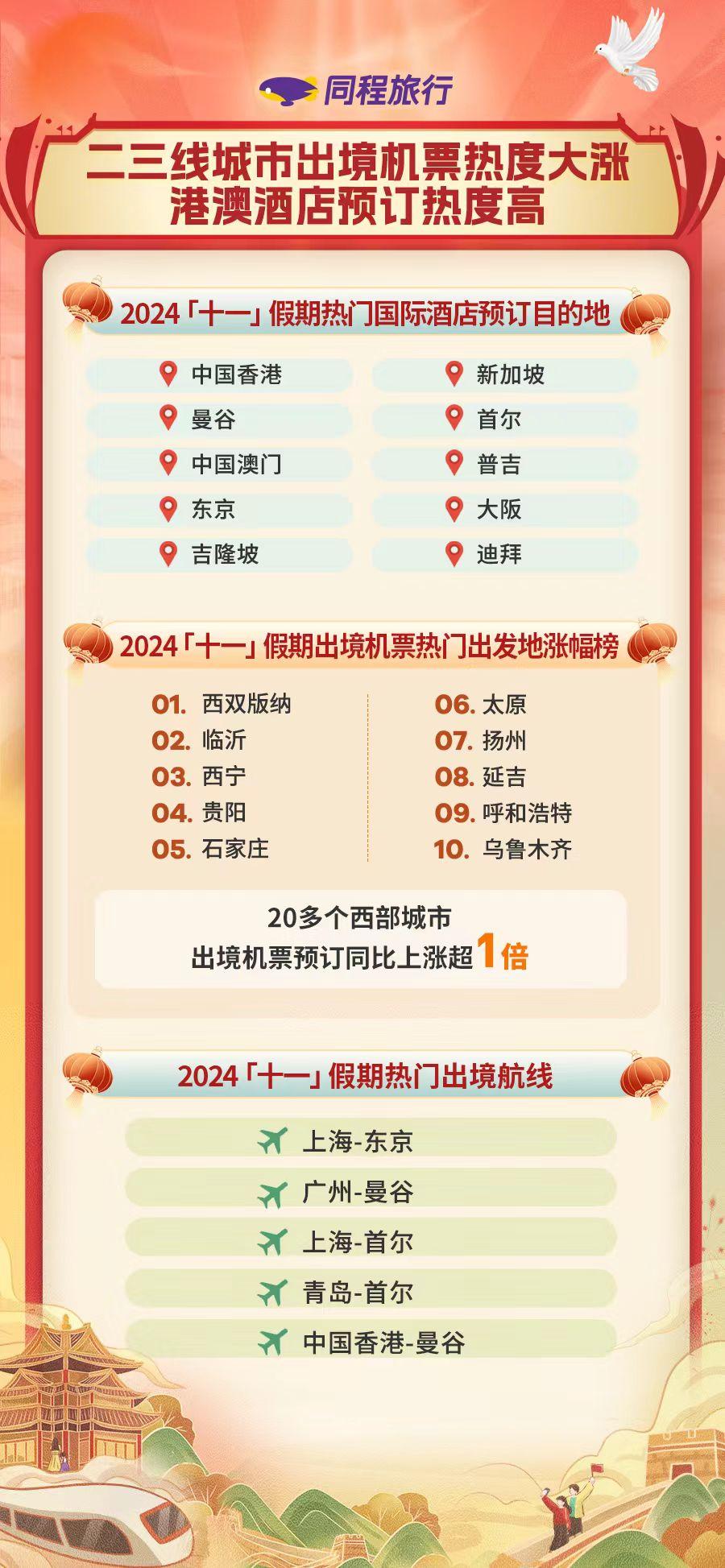 在客源地方面,國(guó)內(nèi)二三線城市居民特別是西部各省區(qū)市居民出境游需求快速增長(zhǎng)。同程旅行數(shù)據(jù)顯示,今年“十一”假期出境游機(jī)票出發(fā)地中,西雙版納、臨沂、西寧、貴陽(yáng)、石家莊等城市出境航班預(yù)訂熱度漲幅最高。有20多個(gè)西部城市出境機(jī)票預(yù)訂同比漲幅超過(guò)1倍。
