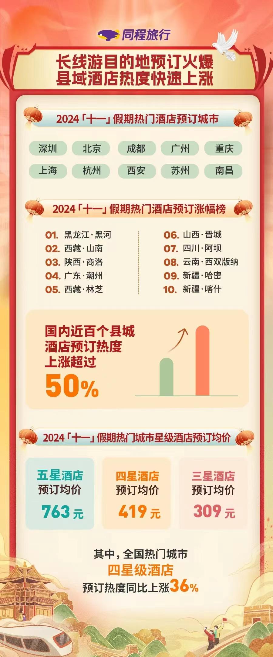 在目的地選擇上,深圳、北京、成都、廣州、重慶、上海、杭州、西安、蘇州、南昌是國(guó)內(nèi)最熱門(mén)的酒店預(yù)訂城市。東北和西部長(zhǎng)線目的地,是城市居民長(zhǎng)假出游的熱門(mén)選擇,黑龍江的黑河,西藏的山南、林芝,新疆的哈密和喀什,以及四川阿壩、云南西雙版納等長(zhǎng)線游目的地進(jìn)入酒店預(yù)訂漲幅榜前十。受?chē)?guó)產(chǎn)游戲《黑神話悟空》的持續(xù)帶動(dòng),山西的晉城酒店預(yù)訂熱度快速上漲,位列榜單第六。