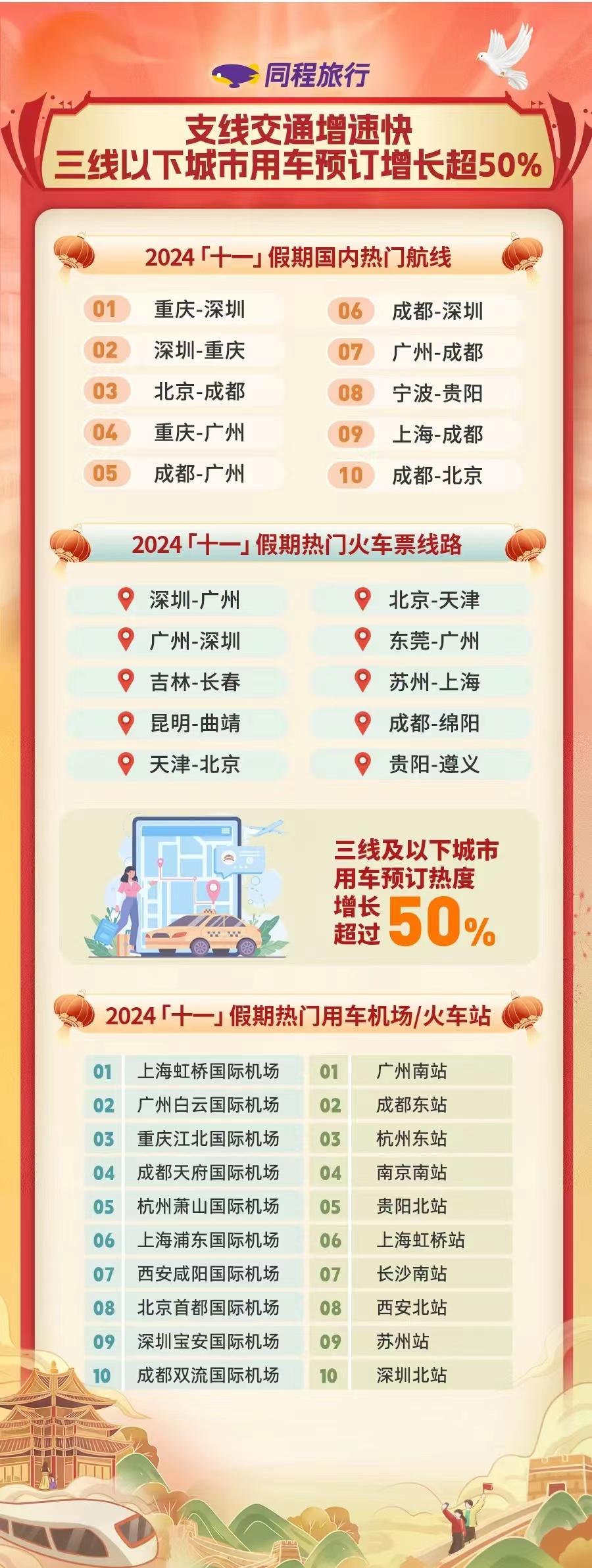 10月7日,同程旅行發(fā)布的《2024“十一”假期旅行消費(fèi)報(bào)告》顯示,2024年“十一”假期,國(guó)內(nèi)旅行消費(fèi)市場(chǎng)持續(xù)增長(zhǎng),二三線及以下城市居民出游消費(fèi)增長(zhǎng)迅速。同程旅行平臺(tái)上,三線及以下城市用車(chē)預(yù)訂熱度增長(zhǎng)超過(guò)50%;縣城文旅成假期消費(fèi)亮點(diǎn),全國(guó)近百個(gè)縣城酒店預(yù)訂熱度同比上漲超過(guò)50%。