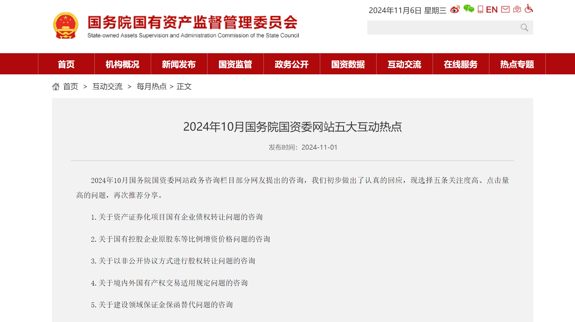 近日,國(guó)務(wù)院國(guó)資委對(duì)2024年10月官網(wǎng)政務(wù)咨詢欄目部分網(wǎng)友提出的咨詢,初步作出了回應(yīng),并選取了5條關(guān)注度高、點(diǎn)擊量高的問題,再次推薦分享。