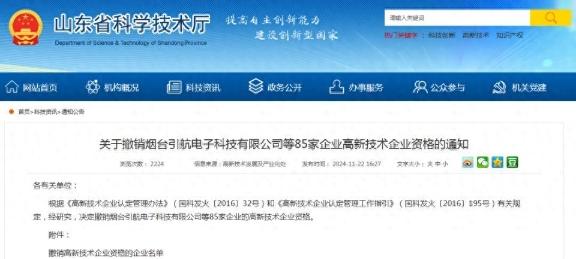 《通知》內(nèi)容顯示,根據(jù)《高新技術(shù)企業(yè)認(rèn)定管理辦法》(國科發(fā)火〔2016〕32號(hào))和《高新技術(shù)企業(yè)認(rèn)定管理工作指引》(國科發(fā)火〔2016〕195號(hào))有關(guān)規(guī)定,經(jīng)研究,決定撤銷煙臺(tái)引航電子科技有限公司等85家企業(yè)的高新技術(shù)企業(yè)資格。山東萊鋼永鋒鋼鐵有限公司則列于名單第78位,證書編號(hào)GR202237007406,撤銷起始年份為2023年。