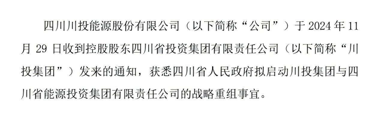 11月29日晚,川投能源、川能動力、華海清科3家A股公司披露,公司接到通知,獲悉四川省人民政府?dāng)M啟動四川省投資集團(tuán)有限責(zé)任公司(簡稱“川投集團(tuán)”)與四川省能源投資集團(tuán)有限責(zé)任公司(簡稱“能投集團(tuán)”)的戰(zhàn)略重組事宜。上述事宜涉及相關(guān)政府部門的批準(zhǔn),尚處于前期籌劃階段,能否獲得批準(zhǔn)存在不確定性。