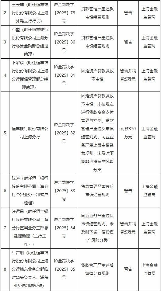 具體看,時(shí)任恒豐銀行上海分行授信管理部總經(jīng)理助理卜家彥被警告并罰款5萬元,涉及的主要違法違規(guī)行為是固定資產(chǎn)貸款發(fā)放不審慎;時(shí)任恒豐銀行上海分行直屬業(yè)務(wù)三部總經(jīng)理助理(主持工作)汪運(yùn)昌被警告并罰款5萬元,涉及的主要違法違規(guī)行為是同業(yè)業(yè)務(wù)嚴(yán)重違反審慎經(jīng)營規(guī)則、未及時(shí)下調(diào)非信貸資產(chǎn)風(fēng)險(xiǎn)分類;時(shí)任恒豐銀行上海外灘支行行長王云非,時(shí)任恒豐銀行上海分行零售金融部總經(jīng)理助理石堃,時(shí)任恒豐銀行上海分行個(gè)貸業(yè)務(wù)一部客戶經(jīng)理陳濤,以及牛古朋被警告,牛古朋歷任恒豐銀行上海分行浦東業(yè)務(wù)總部臨時(shí)牽頭負(fù)責(zé)人、浦東業(yè)務(wù)總部總經(jīng)理,他們涉及的主要違法違規(guī)行為是貸款管理嚴(yán)重違反審慎經(jīng)營規(guī)則。