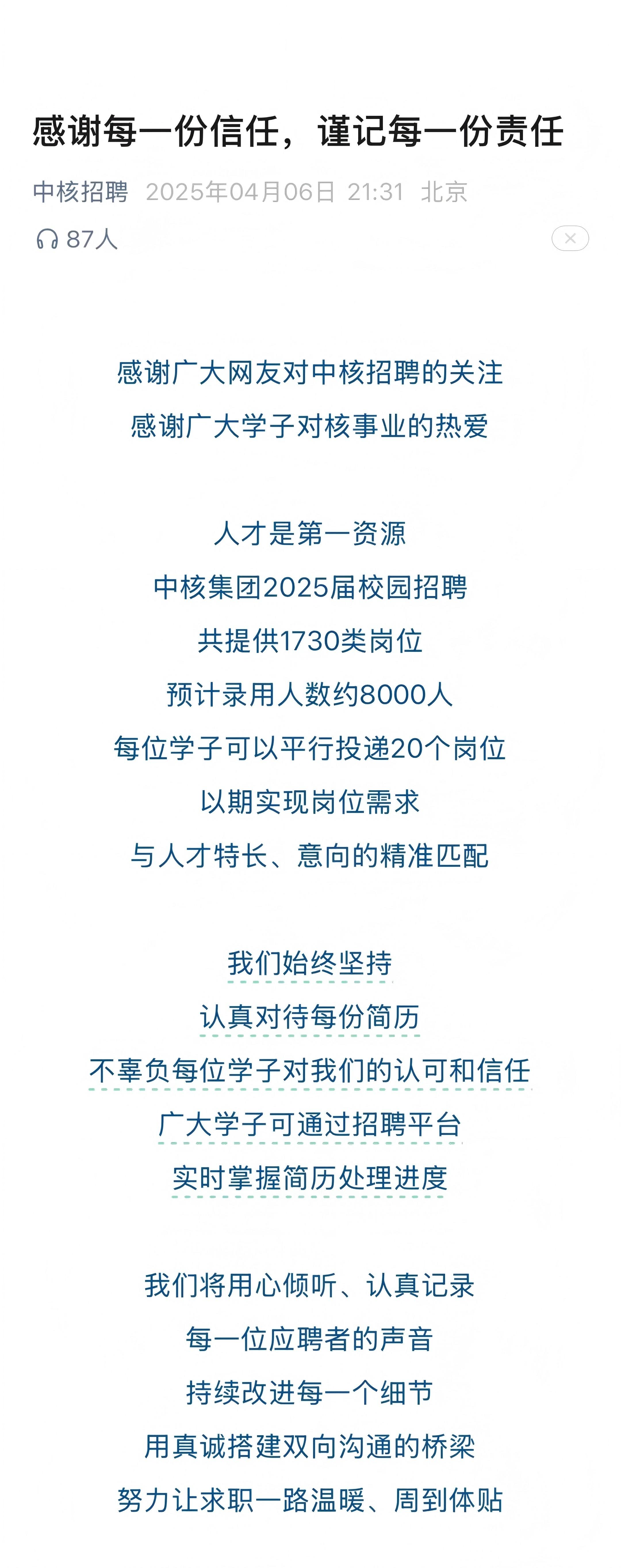 4月6日晚,中核招聘官微發(fā)布聲明《感謝每一份信任,謹記每一份責(zé)任》,回應(yīng)收到一百多萬份簡歷:感謝廣大網(wǎng)友對中核招聘的關(guān)注,感謝廣大學(xué)子對核事業(yè)的熱愛。人才是第一資源,中核集團2025屆校園招聘,共提供1730類崗位,預(yù)計錄用人數(shù)約8000人,每位學(xué)子可以平行投遞20個崗位,以期實現(xiàn)崗位需求與人才特長、意向的精準匹配。