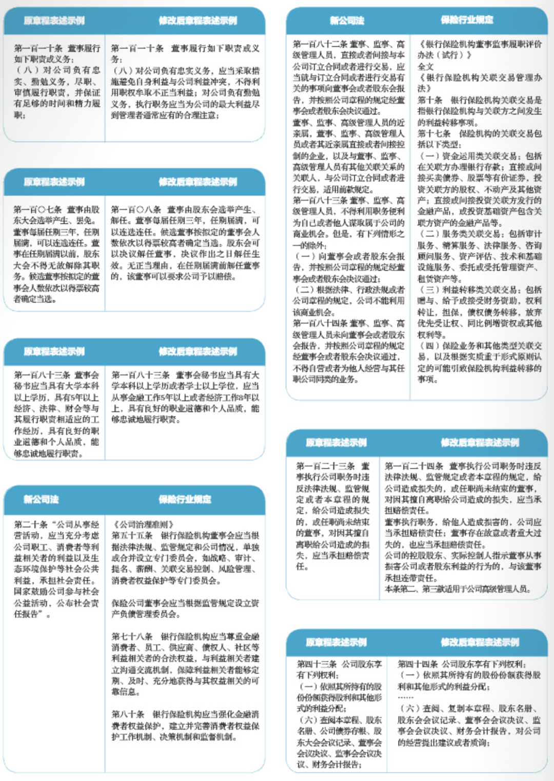 新公司法第一百八十二條至第一百八十四條對董事、監(jiān)事、高級管理人員忠實義務作出細致規(guī)定,分別涉及自我交易、謀取公司商業(yè)機會、競業(yè)等方面?!躲y行保險機構關聯(lián)交易管理辦法》對保險機構關聯(lián)交易的類型進行了具體羅列,還對關聯(lián)交易的交易金額、重大程度作出規(guī)定,并明確保險公司的董事會應當設立關聯(lián)交易控制委員會,董事會對關聯(lián)交易管理承擔最終責任,這些都為保險公司關聯(lián)交易管理的具體執(zhí)行提供了依據(jù)。筆者認為,保險機構在修訂章程時,應按照前述更為嚴格的規(guī)定完善諸如關聯(lián)交易等內容。