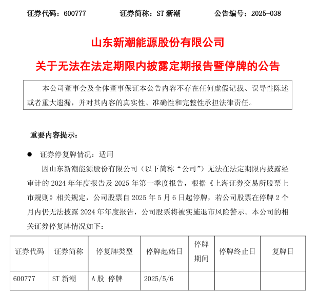 4月30日,公司披露關(guān)于無法在法定期限內(nèi)披露定期報告暨停牌的公告。按照相關(guān)規(guī)定,公司在股票停牌后兩個月內(nèi)仍未披露2024年年度報告的,將被實施退市風(fēng)險警示;如公司股票交易被實施退市風(fēng)險警示之日起兩個月內(nèi)仍未披露過半數(shù)董事保證真實性、準(zhǔn)確性和完整性的2024年年度報告,公司股票將被終止上市。