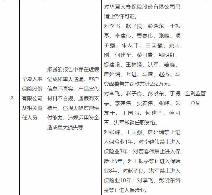 對張峰、王國強、房延瑞禁止進入保險業(yè)1年;對李建偉禁止進入保險業(yè)3年;對賈春偉禁止進入保險業(yè)5年;對于振亭禁止進入保險業(yè)8年;對趙子良、洪軍禁止進入保險業(yè)10年;對李飛、彭曉東終身禁止進入保險業(yè)。