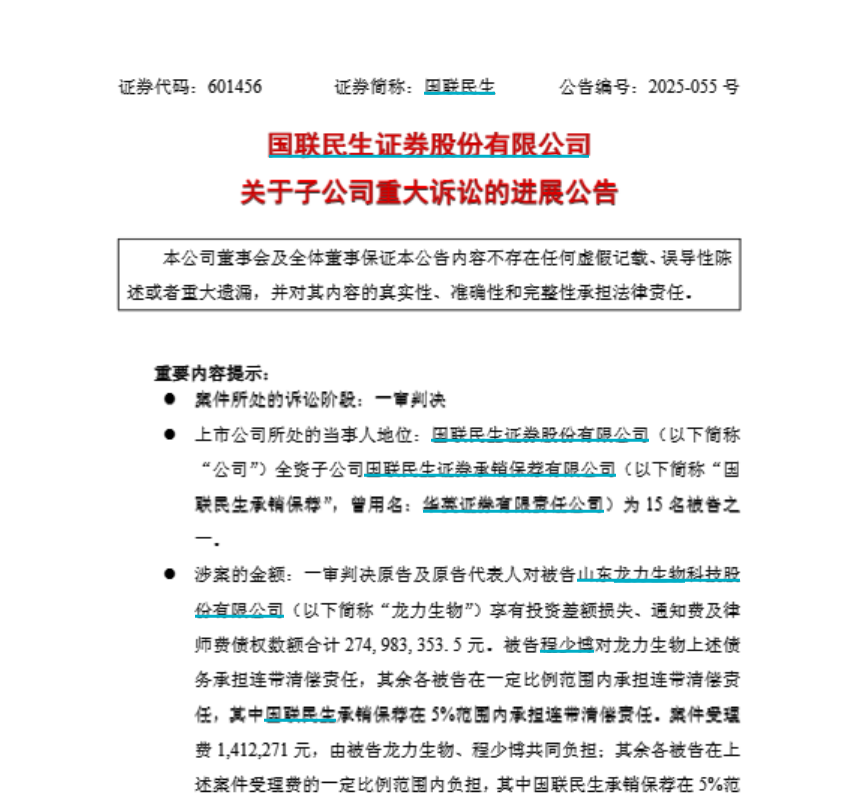 中介機構(gòu)方面,國聯(lián)民生證券承銷保薦有限公司(簡稱“國聯(lián)民生承銷保薦”)在原告各項損失5%的范圍內(nèi)承擔連帶賠償責任,立信會計師事務所(以下簡稱“立信所”)在原告各項損失30%的范圍內(nèi)承擔連帶賠償責任。8月26日晚間,國聯(lián)民生發(fā)布關(guān)于子公司重大訴訟的進展公告,公告了該事項。