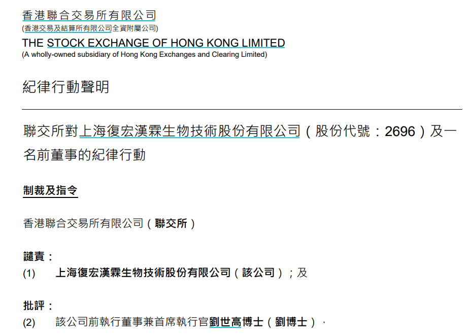 9月2日,復宏漢霖(2696.HK)公告了一份聯交所對公司及一名前董事的紀律行動聲明。文件顯示,復宏漢霖受到港交所譴責,而公司前執(zhí)行董事兼CEO劉世高受到批評。港交所要求劉世高接受26小時有關監(jiān)管和法律議題以及上市規(guī)則合規(guī)事宜的培訓,才能再獲委任為任何已于或將于聯交所上市的公司董事。