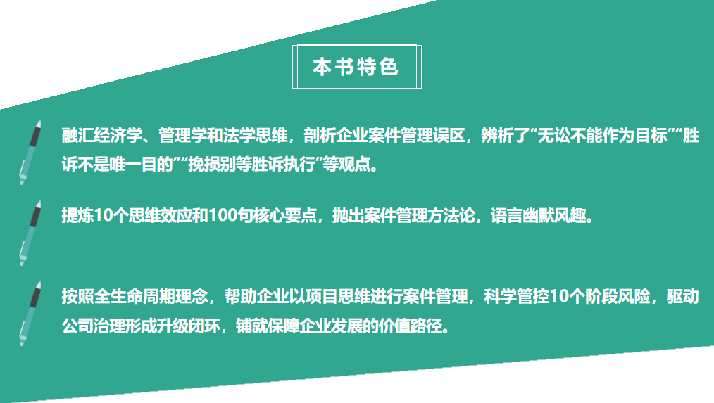 本書融匯經(jīng)濟學(xué)、管理學(xué)和法學(xué)思維,深入企業(yè)改革發(fā)展實踐,跳出具體法律糾紛個案的代理技巧,幫助企業(yè)系統(tǒng)管理案件。