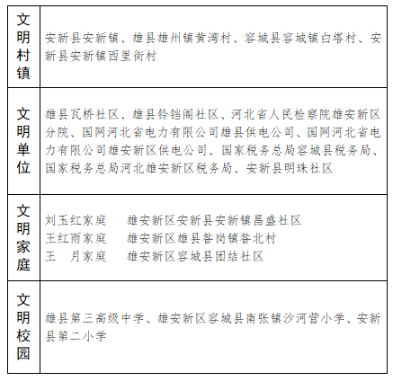 2018-2020年度河北省文明村鎮(zhèn)、文明單位、文明家庭、文明校園表彰名單(雄安新區(qū)部分)