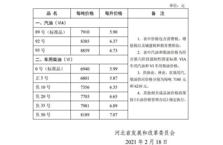 2月18日,河北省發(fā)展和改革委員會(huì)發(fā)布《關(guān)于調(diào)整我省成品油價(jià)格的公告》。根據(jù)現(xiàn)行成品油價(jià)格形成機(jī)制,自2021年2月18日24時(shí)起,河北省汽、柴油價(jià)格(標(biāo)準(zhǔn)品)每噸分別提高275元、265元,調(diào)整后的汽、柴油最高零售價(jià)格見下表。乙醇汽油價(jià)格按同標(biāo)號(hào)汽油(VIA)價(jià)格執(zhí)行,普通柴油價(jià)格按照同標(biāo)號(hào)車用柴油(VI)價(jià)格執(zhí)行,98號(hào)汽油價(jià)格由成品油生產(chǎn)經(jīng)營企業(yè)根據(jù)市場(chǎng)情況自主制定具體價(jià)格。(河北日?qǐng)?bào)記者潘文靜)