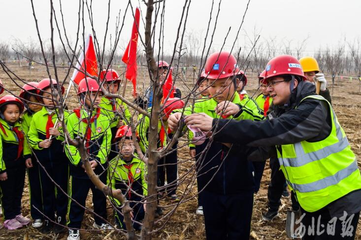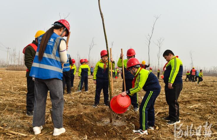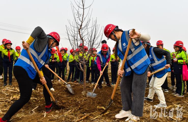 2021年3月11日,“千年秀林”管護(hù)人員與容城縣賈光鄉(xiāng)東張楚小學(xué)的學(xué)生們一起種下“雄安樹(shù)”。