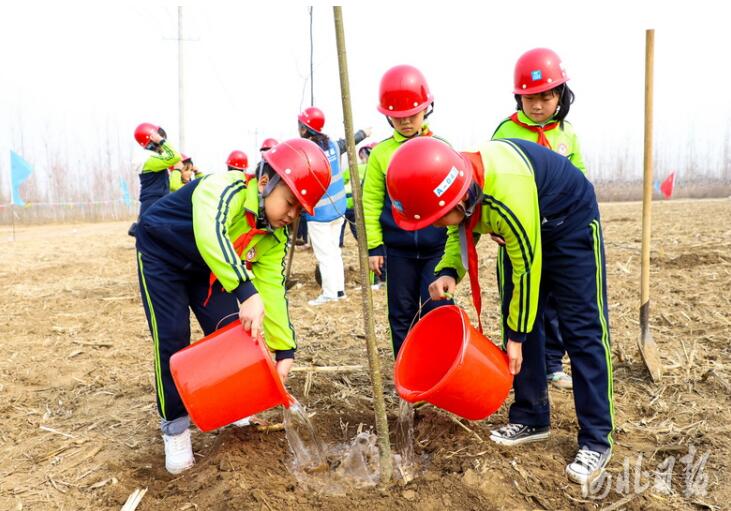 2021年3月11日,容城縣賈光鄉(xiāng)東張楚小學(xué)的學(xué)生們?yōu)闃?shù)苗澆水。