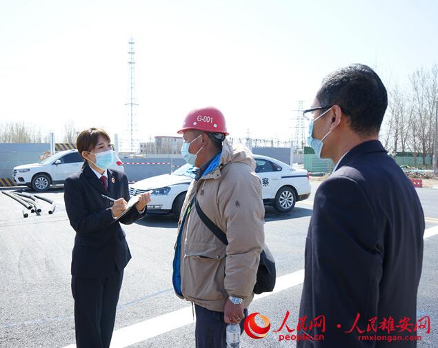 容城縣人民檢察院工作人員前往施工現(xiàn)場(chǎng)了解農(nóng)民工工資發(fā)放情況。李紫宣攝