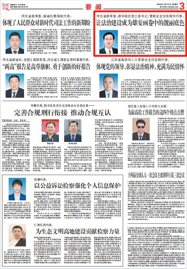 3月10日出版的《檢察日報》刊發(fā)了題為《河北省委常委,雄安新區(qū)黨工委書記、管委會主任張國華代表: 讓法治建設(shè)成為雄安畫卷中的靚麗底色 》的報道,一起來看↓↓↓