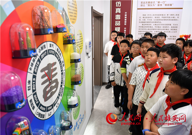 4月19日,雄安容和海棠小學的同學們正在禁毒教育體驗區(qū)內(nèi)學習禁毒知識。人民網(wǎng) 宋燁文攝