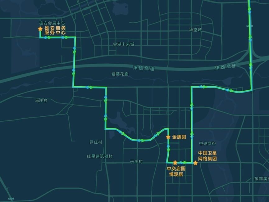雄安新區(qū)設(shè)置4個上下客站點(diǎn),從雄安商服中心站始發(fā),途經(jīng)博觀居站、金輝園站、中國星網(wǎng)站。