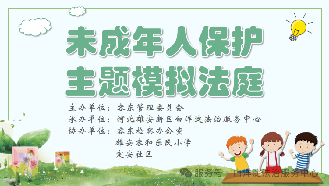 受容東片區(qū)管理委員會(huì)委托,河北雄安新區(qū)白洋淀法治服務(wù)中心在容東檢察辦公室、雄安容和樂(lè)民小學(xué)、定安社區(qū)的配合下,組織在校學(xué)生開展了以未成年人保護(hù)為主題的模擬法庭活動(dòng),為同學(xué)們帶來(lái)了一堂別開生面的法治教育課。