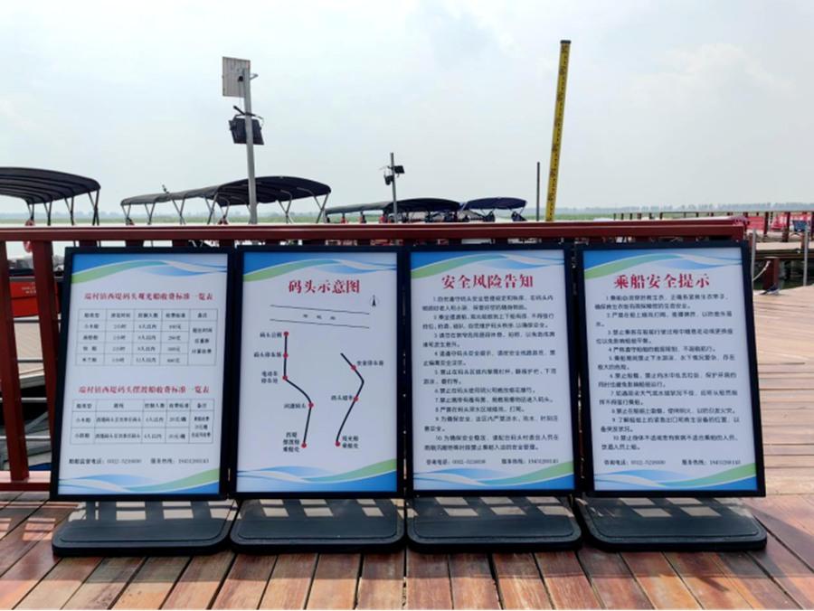 統(tǒng)一服務(wù)、標準化流程。每艘船出發(fā)前,船工都會用擴音器播放安全提示。乘船安全提示、安全風險告知等展牌整齊地擺放在出入口。志愿者會在碼頭為游客提供服務(wù)。
