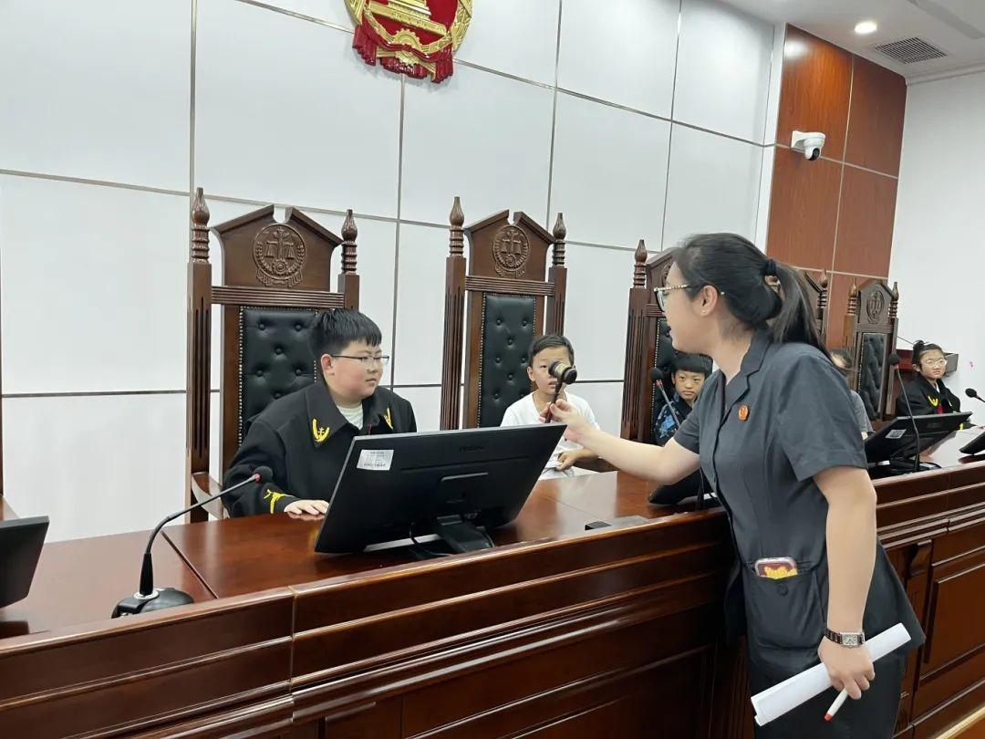 審判庭是此次參觀的“重頭戲”。推開(kāi)審判庭厚重的大門(mén),審判席、原告席、被告席整齊排列,莊嚴(yán)的氛圍讓孩子們瞬間安靜下來(lái),在工作人員的邀請(qǐng)下,孩子們輪流坐上審判席,感受法袍的重量與審判席的莊嚴(yán),他們輕輕敲擊法槌,體驗(yàn)“小法官”的感覺(jué)?!扒梅ㄩ硶r(shí)要嚴(yán)肅,因?yàn)檫@代表著公正裁判”工作人員為其科普法槌的意義,孩子們似懂非懂地點(diǎn)頭,小臉上寫(xiě)滿了認(rèn)真。