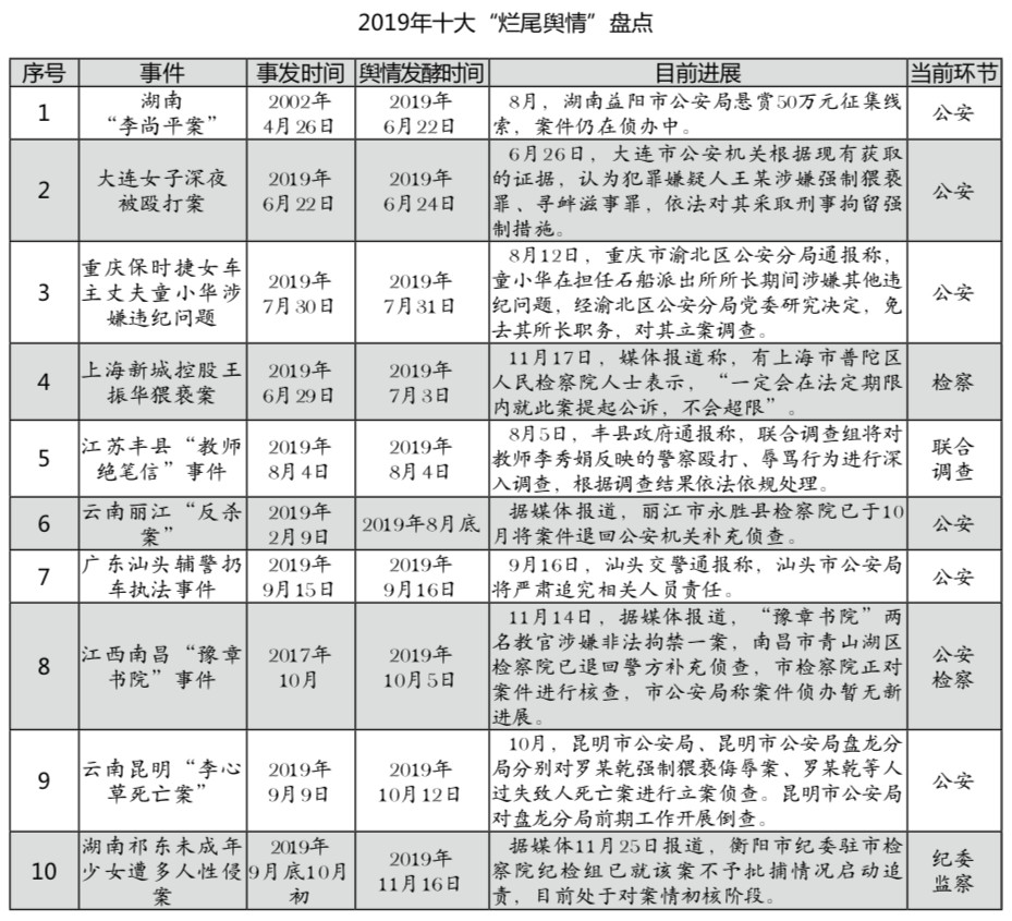 編者按:今年的網(wǎng)絡(luò)輿論場并不平靜,多起涉政法事件引爆輿論場,并發(fā)酵成為全網(wǎng)關(guān)注的熱點輿情,引發(fā)輿論震動。如備受輿論矚目的孫小果案、鄧世平案,從曝光之日起,就牽動著無數(shù)輿論目光。近日,相關(guān)涉案人員陸續(xù)受審獲刑,背后的“保護傘”也被立案調(diào)查。這類重大輿情事件不“爛尾”,體現(xiàn)出各級政法機關(guān)依法履行職責的自覺和擔當,值得稱道。然而也需看到,2019年接近尾聲,仍有不少輿情事件沒有掃尾,輿論場還遺留大量問號等待拉直。近年來,政法網(wǎng)絡(luò)輿情回應率穩(wěn)步提升的前提下,輿情事件的處置完結(jié)率卻忽高忽低,2019年上半年不到六成事件有最終結(jié)果,遠低于2018年全年75%的比率。鑒于此,法制網(wǎng)輿情中心(ID:fzwyqzx)盤點這一年的重大政法輿情事件,梳理出那些長時間沒有進展和結(jié)果的“爛尾輿情”,并通過分析其類型、總結(jié)其特征、剖析其危害,提出規(guī)避與應對的建議,以供有關(guān)部門參考借鑒。