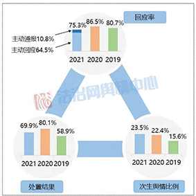 從回應(yīng)主體來看,與2020年相比,由涉事部門進行回應(yīng)的事件數(shù)量占比有所增加,達到62.9%,表明涉事主體主動作為的積極性有所提升;而上級主管部門介入回應(yīng)的比重下降了近7個百分點,側(cè)面反映出涉事部門輿情應(yīng)對能力在逐步精進,能夠較為及時遏制輿情擴散和波及的范圍,一定程度上減輕了級主管部門的應(yīng)對壓力。同時,第三方回應(yīng)的事件數(shù)量比重也略微提升了約2個百分點,顯示出不少輿情事件呈現(xiàn)復(fù)雜化特征,牽涉主體逐漸多元化并且覆蓋多個領(lǐng)域系統(tǒng),這對部門間的協(xié)調(diào)銜接工作也提出了更高的要求。此外政法機關(guān)內(nèi)部多主體回應(yīng)的情況稍有減弱,相關(guān)案例所占比重較2020年減少了一半以上,為4.9%。
