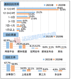 從回應(yīng)渠道來看,官方所依托的發(fā)聲渠道更為集中,有超過六成的輿情事件是借助兩微平臺做出回應(yīng),占比較2020年進一步提升;依靠媒體報道進行回應(yīng)的比重為29%,較上一年下降了近7個百分點;以官網(wǎng)發(fā)布作為回應(yīng)渠道的事件略微增多,占比8.1%。目前來看,大多數(shù)回應(yīng)主體之所以選擇自有渠道主動做出回應(yīng)而非采取第三方轉(zhuǎn)達的方式,是因為一方面集中的內(nèi)容公開明顯提升了回應(yīng)的權(quán)威性,避免被多方轉(zhuǎn)述造成信息誤差從而導(dǎo)致內(nèi)容被公眾曲解的風(fēng)險,另一方面也可以通過社交平臺直面公眾質(zhì)疑,與輿論達成直接有效的溝通,對接網(wǎng)民“輿論監(jiān)督”的參與期待,以便更好化解輿論爭議。