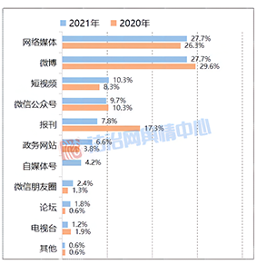 2021年,網(wǎng)絡(luò)媒體與微博仍為政法輿情最主要的“策源地”,自兩平臺初步曝光進而發(fā)酵的輿情事件數(shù)量占比超55%。發(fā)酵于短視頻平臺的政法輿情占比自2019年以來出現(xiàn)“兩連漲”,僅次于網(wǎng)絡(luò)媒體和微博。相比之下,源自報刊、電視臺等傳統(tǒng)媒體的輿情占比持續(xù)減少,尤其是源于報刊的輿情大幅減少,數(shù)量占比自上一年度的17.3%銳減為7.8%。