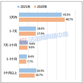 從輿情爆發(fā)時長來看,2021年與2020年的整體差別不大,從事發(fā)到輿情發(fā)酵的所用時間依舊偏短,主要爆發(fā)時長都集中在7天以內(nèi),占比累計超六成,其中1天內(nèi)爆發(fā)的輿情事件比重遠高于其他時長的,達到45.5%。由此可見,在以移動社交媒體為主要傳播途徑的時代,信息傳播速度不斷提升,輿論節(jié)奏也被持續(xù)壓縮。例如在網(wǎng)民“辣筆小球”侮辱戍邊英烈一案中,其違法言論一經(jīng)發(fā)布便遭到網(wǎng)民譴責(zé),事發(fā)后不到12小時,個人微博被禁言,當(dāng)天新華社、《人民日報》等央媒對此事發(fā)表評論,次日當(dāng)?shù)鼐骄蛯ο右扇瞬扇⌒淌聫娭拼胧┎⑦M行通報,事件從發(fā)酵到處置僅用一天左右的時間,進展速度很快。此外,與2020年相比,2021年中輿情發(fā)酵與事發(fā)間隔1至3年的事件占比翻番,達到7.2%,如北京“教授狀告知網(wǎng)侵權(quán)案”在獲得新進展之后再度引發(fā)關(guān)注,說明無論案件是否已經(jīng)閉環(huán),只要爭議尚存,輿情就仍有復(fù)燃的風(fēng)險。